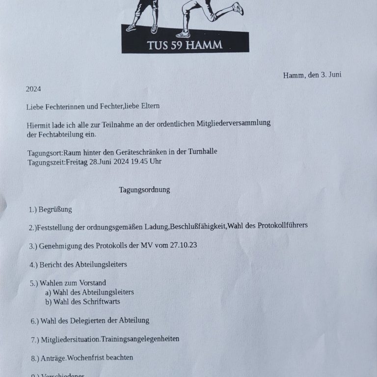 Liebe Fechterinnen und Fechter, liebe Eltern, hiermit lade ich alle zur Teilnahme an der ordentlichen Mitgliederversammlung der Fechtabteilung ein. Tagungsort: Raum hinter den Geräteschränken in der Turnhalle Tagungszeit: Freitag, 28.06.2024, 19:45 Uhr Tagungsordnung: Jürgen Lübben, Abteilungsleiter