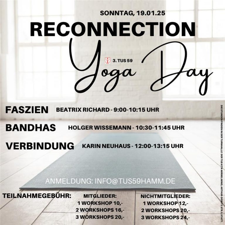 Verbinde Dich mit Deinem Ich ! Reise am Sonntag, 19. Januar 2025 mit bis zu drei verschiedenen Workshops durch die Vielseitigkeit des Yoga und verbringe achtsame Momente mit Dir selbst! Faszien – Beatrix Richard lässt Dich Deine Faszien spüren (9-10:15 Uhr) Bandhas – entdecke mit Holger Wissemann die Energieventile (10:30-11:45 Uhr) Verbindung – Karin Neuhaus…